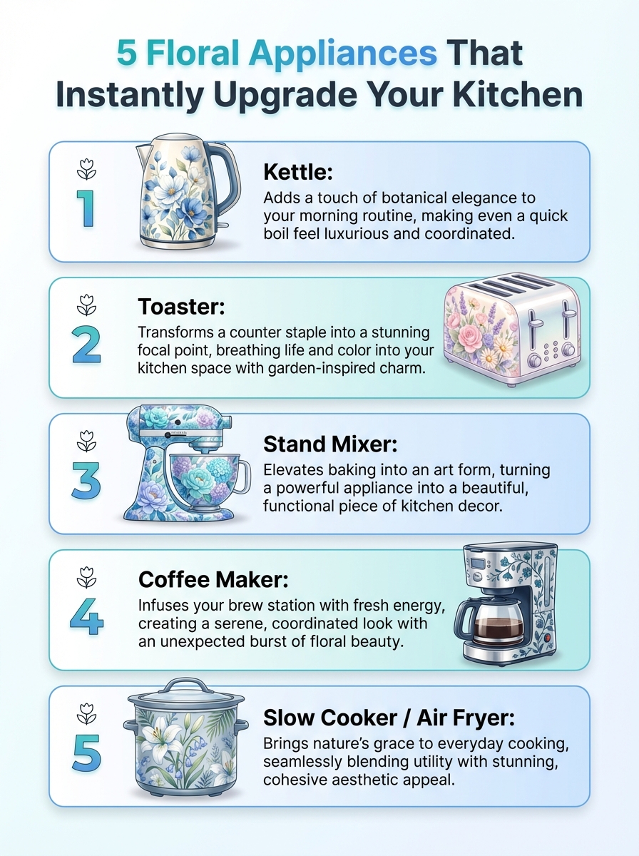Infographic: 5 floral-patterned appliances to upgrade your kitchen with easy floral decor ideas.